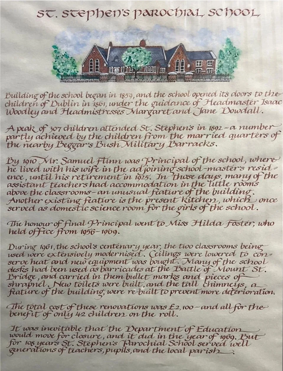 The laughter of 307 young hearts once filled these halls during the peak of its glory in 1892. Among them were the children from the married quarters of the nearby Beggars Bush Military Barracks. By the turn of the century, in the year 1910, Mr. Samuel Flynn took up the mantle of Principal. With his wife, they made their home in the graceful residence adjoining the school.